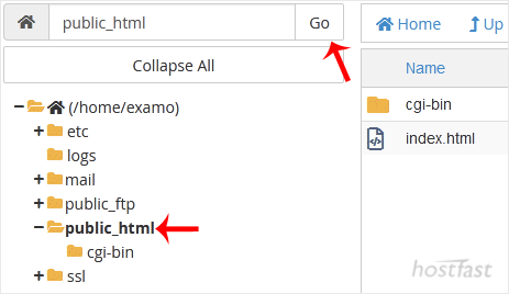 3. In cPanel File Manager, navigate to the directory where you want to upload your files to. For example, should you wish to upload your files to the public HTML directory, you must first go to /public_html. On the left side, in the list of directories, double click on the public_html directory.