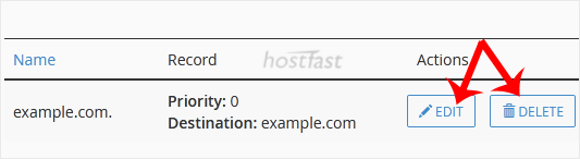 5. Locate the MX Record you want to edit or remove. To edit an MX record, click on Edit and modify the details. Then confirm with Save Record. Removing a record can be done with the Delete option.