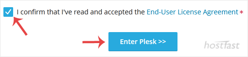 Final Step: Scroll down to the end of the page, read and accept the End-User License Agreement. Click on Enter Plesk.